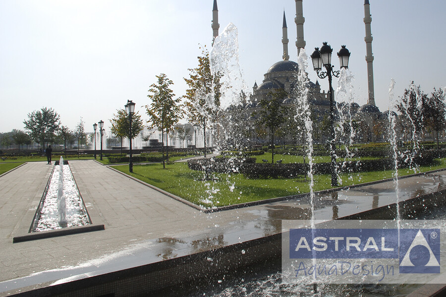Статический фонтан-дорожка состоящий из двух чаш (длиной 15 метров каждая), оборудованный пенными насадками дополнил собой водное шоу Бегущяя волна, о котором мы рассказывали ранее. Оба этих водных объекта расположены рядом с мечетью им. Ахмада Кадырова.