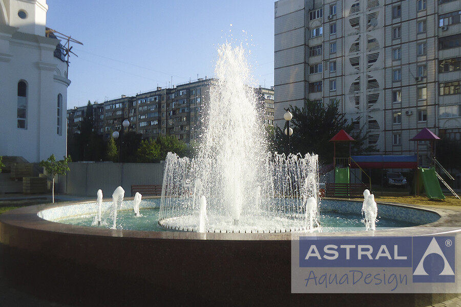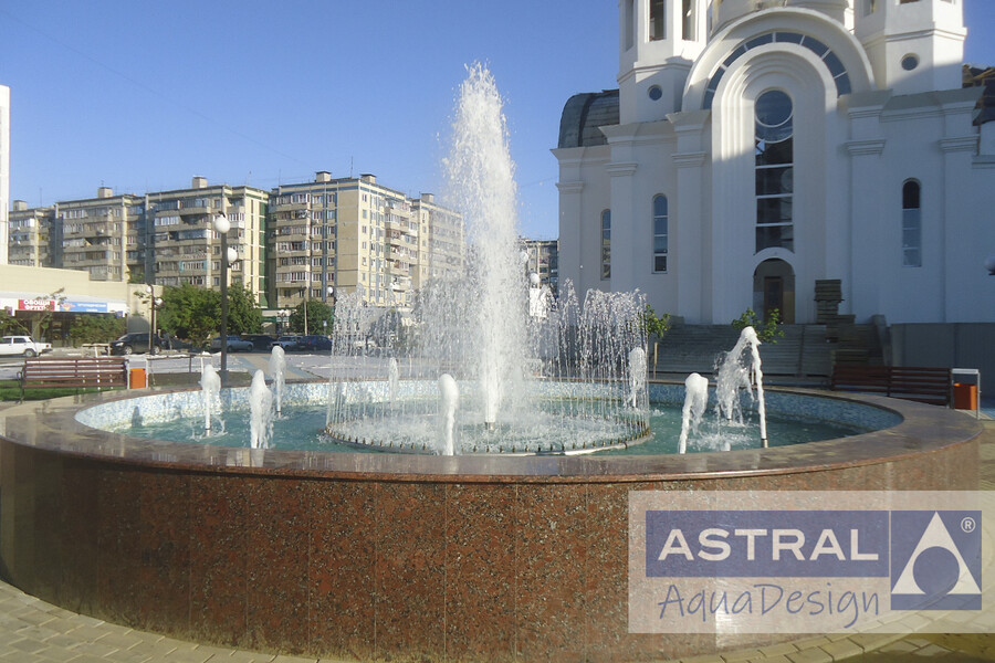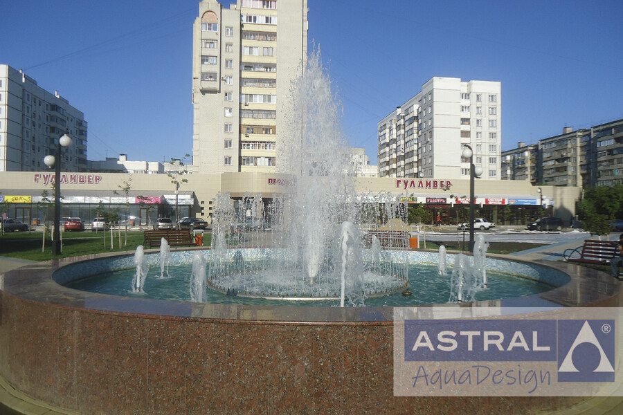 Цветодинамический фонтан был постоен при участии наших специалистов в Белгороде на улице Конева. Круглая чаша диаметром 6 метров отделана гранитом. А водную композцию образуют пенные насадки различной кофигурации и одна кольцевая. Множество RGB светильников раскрашивают фонтан в яркие цвета с наступлением темноты. Вечером горожане могут наслаждаться завораживающим танцем водных струй.