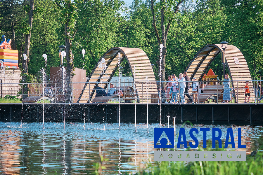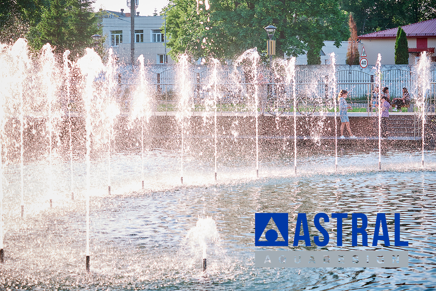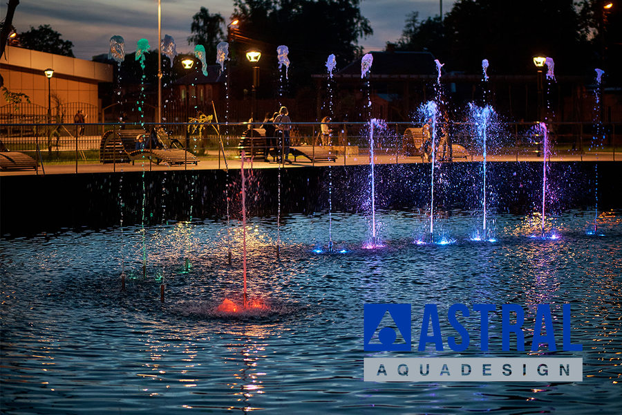 Для подсветки использовано 40 RGB светильников серии Astral Mini мощностью 15 Вт. Погружные насосы из нержавеющей стали 0,7 кВт/220В Astral pump в количестве 20 шт. отвечают за бесперебойную работу фонтана. Светильники Astral Mini и насосы Astral pump выпускаются под брендом Astral Aquadesign. Данное оборудование произведено в России!