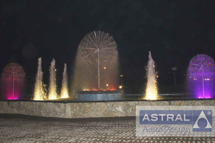 Три сферические насадки и шесть пенных создают интересный водный рисунок за подсветку отчечают светодиодные RGB светильники. Пруд имеет площадь 400 кв.м. а высота водопада составляет 2 метра.
