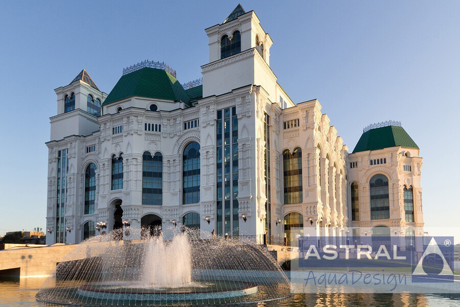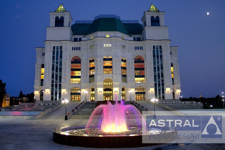 Фонтанный комплекс, построенный на площади перед музыкальным театром в Астрахани стал одним из главных ее украшений. Реализация проекта велась при участии наших специалистов совмествно с компанией «Милайт». Композиция из трех цветодинамических фонтанов органично сочетается с дизайном самой площади и оформлением фасада здания театра. Два больших водных объекта располагаются по бокам от в хода, а третий в центре площади. Их габариты от 10 до 20 метров соответственно.