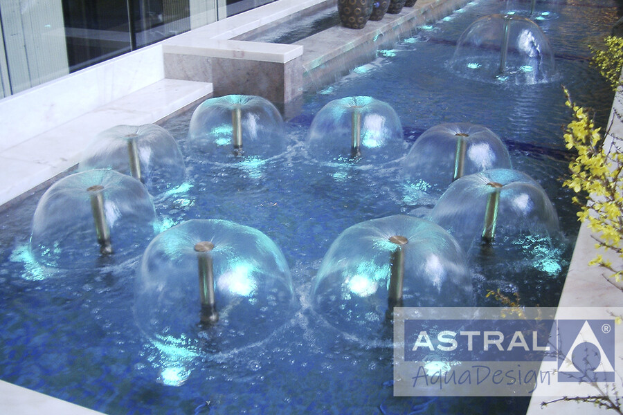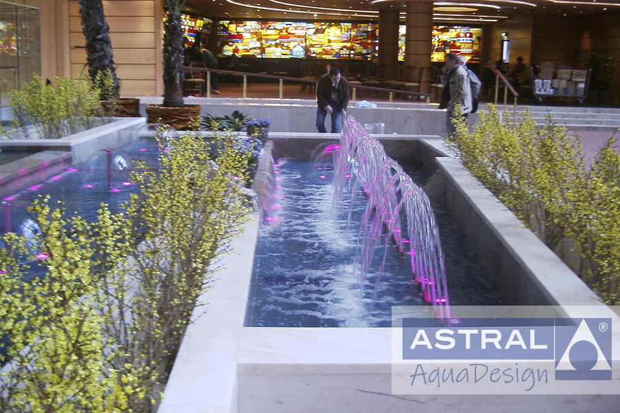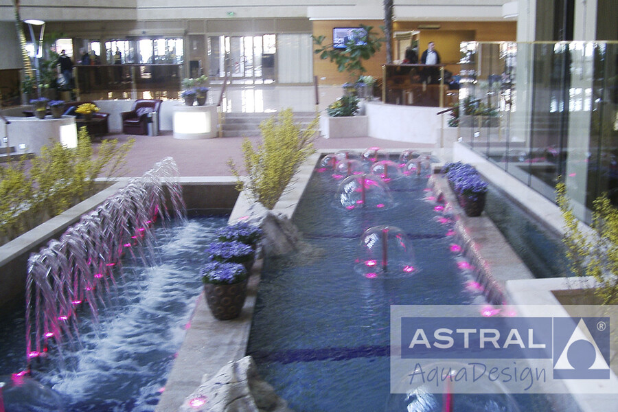 Этот фонтан украшает холл гостиницы Международная в Москве. Чаша состоит из двух частей и спроектирована таким образом чтобы органично сочетаться с цветниками. Наши сотрудники учли пожелание руководства гостиницы - сделать тихий но эффектный фонтан который не будет беспокоить постояльцев. И успешно справились с ним, благодаря установке нескольких пленочных насадок установленных создают эффектный водный рисунок. Ряд параболических струй, дополняет его. А переливы позволяют воде плавно перетекать из одной половины чаши в другую.