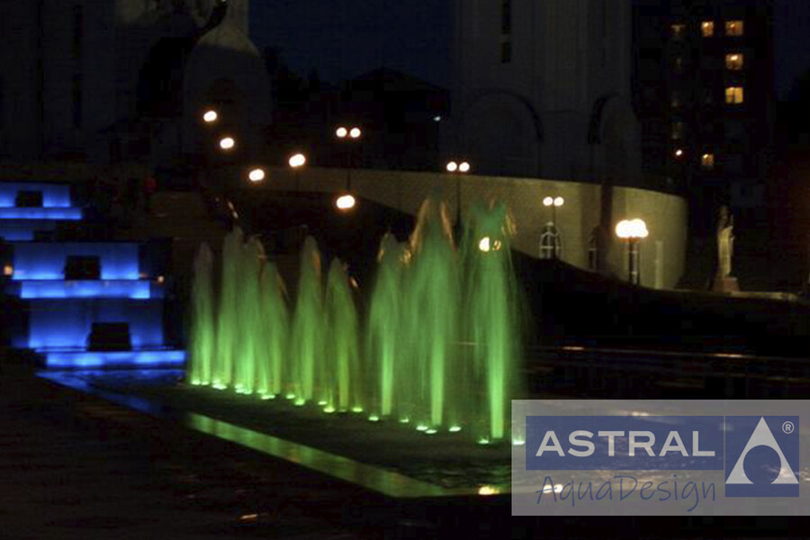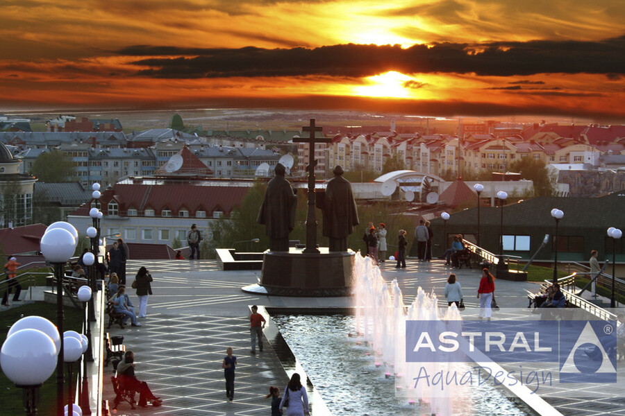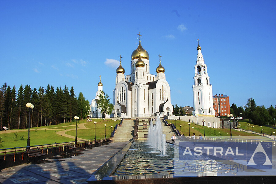Фонтанный комплекс, получивший название "Дорога к храму" построен в городе Ханты-Мансийске. Он состоит из нескольких чаш разделенных между собой камнями на которых выгравированы христианские заповеди. Пенные насадки установленные по всему периметру создают пышный водный рисунок. Каждая струя подсвечивается RGB светильниками. Строительство фонтанного комплекса велось при непосредственном участии наших специалистов.