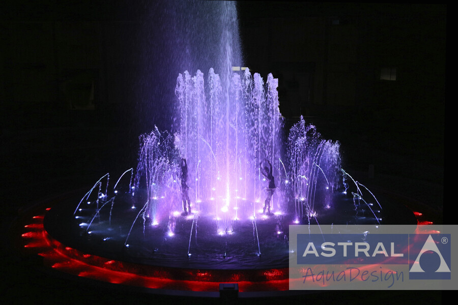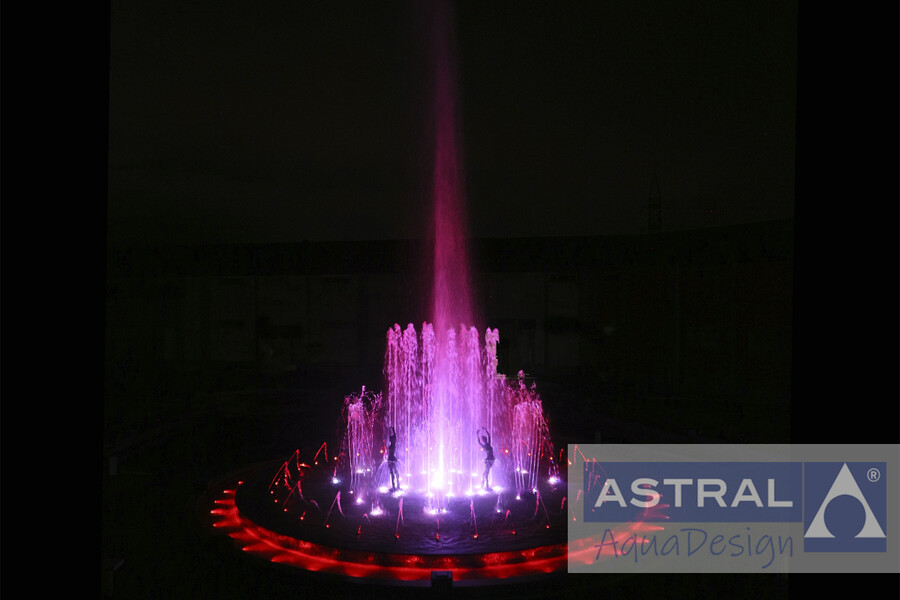 Круглая чаша фонтана диаметром 14 метров и состоит из двух частей, соединенных между собой переливами. Динамику добавляют два вида насадок: ротационные и качающиеся. С наступлением темноты, каждая посдвечивается яркими энергосберегающими светильниками. При строительстве использованы насосы большой мощности, поэтому высота центральной струи может достигать 20 метров.