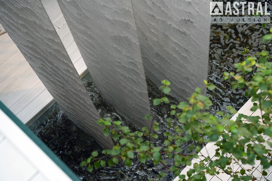 Кольчужный водопад стал в последние время очень популярным в новых современных интерьерах. Дизайнеров, прежде всего, привлекает эффект плавного волнообразного падения воды благодаря специальной текстуре сетки из нержавеющей стали. Такой сетчатый водопад обладает рядом преимуществ, такие как бесшумность, непрерывность потока, минимальное разбрызгивание легкое последующее обслуживание при эксплуатации водного объекта.