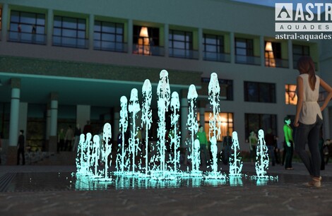 Здесь представлена концепция нового пешеходного фонтана из 16 струй. Плоскостной динамический фонтан "Мой район" оснащен подсветкой и работаем по 2-м контурам воды и 4-м контурам света.