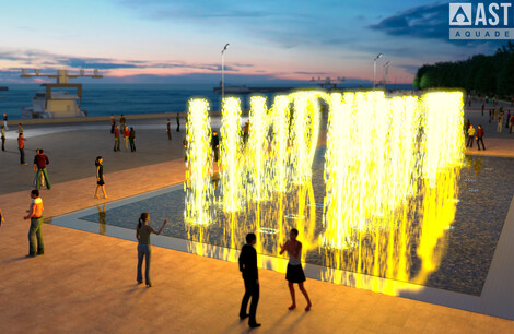 Здесь представлена концепция нового пешеходного фонтана из 16 струй. Плоскостной динамический фонтан "Мой район" оснащен подсветкой и работаем по 2-м контурам воды и 4-м контурам света.