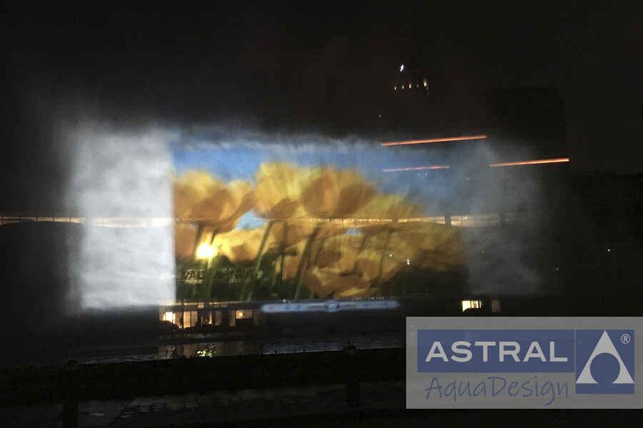 Водный экран довольно необычный вид плавающих фонтанов. Специально сконструированная насадка создает довольно широкую поверхность (HDTV (16: 9) которая служит идеальной поверхностью для проецирования видео и лазерных узоров. А в дневное время он украшает водоем и насыщает его кислородом.